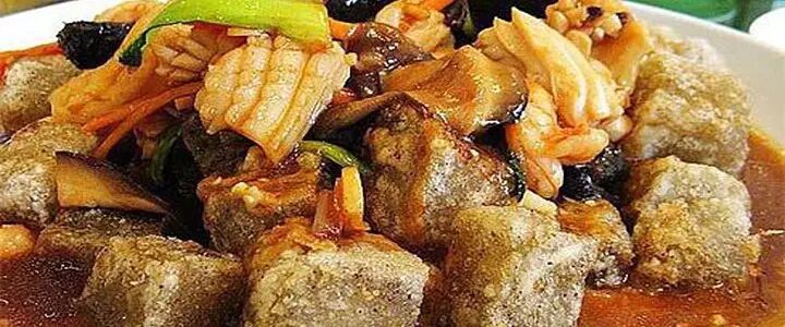 这道小吃是用凉粉做出来的,先用平底锅把凉粉煎好了,再把炒好的海鲜和蒜泥啊、芝麻酱啊、酱油啊、醋啊这些辅料放进去,然后就做好了。