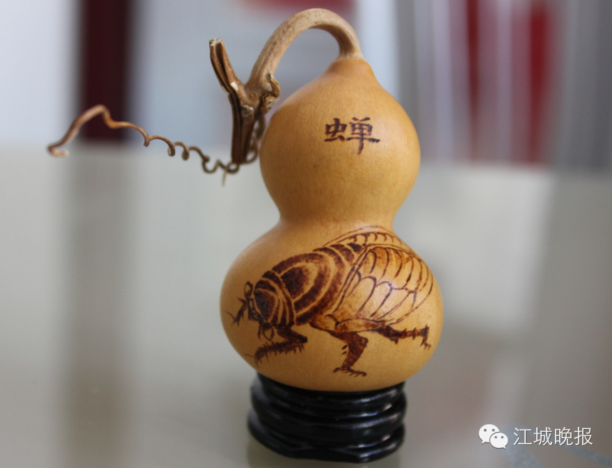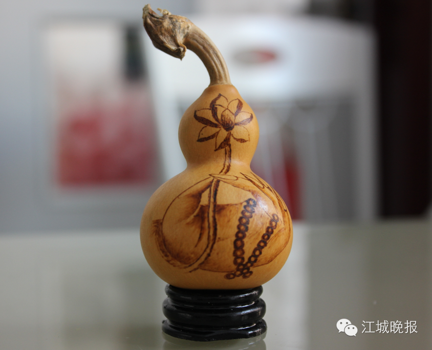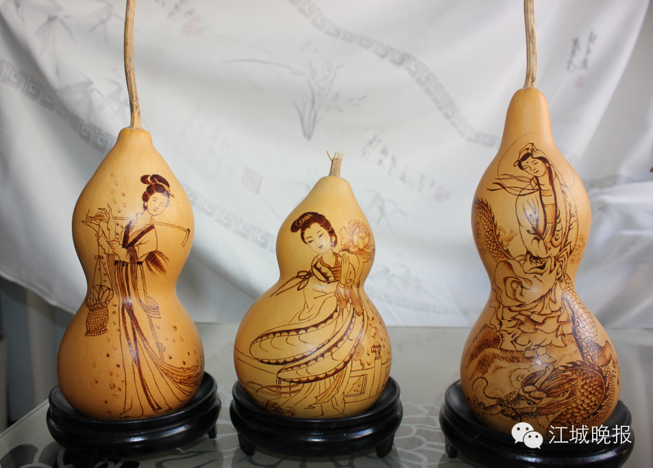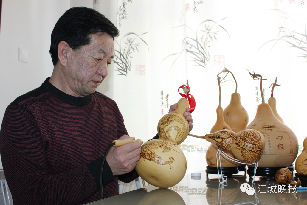 玲珑精巧的葫芦加上独具匠心的构图,再配上一幅幅挺拔娟秀的小楷,这样的葫芦烫画让人叫绝。在磐石市有一位老师,他能在一个个形态各异的葫芦上,创作出不同的作品,他的葫芦烫画形象逼真、寓意吉祥,深受人们喜爱。