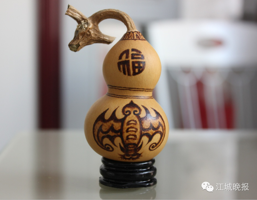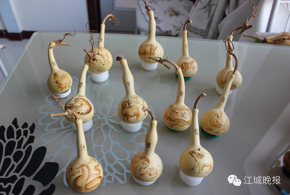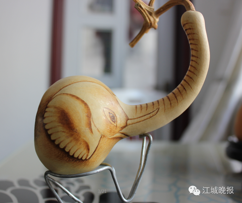“葫芦种类多样,个体间也是千差万别,要想使烫画与葫芦达到完美融合,顺势而为极其重要。”傅新政说:“在他眼里没有好坏葫芦之分。”所以,在他的诸多作品中,不但葫芦形状千奇百怪,而且烫画内容也是千差万别。越是形状扭曲的葫芦,创作出来的图案越活灵活现。一个个歪曲的葫芦被他打造成活灵活现的小鸟、栩栩如生的大象、憨态可掬的小猪……