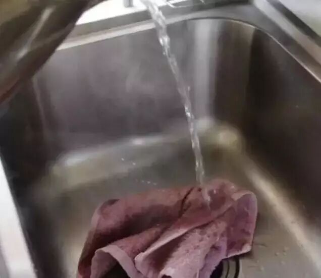 图九:100度滚开水浇透毛巾,拧毛巾至半干有沥水。注意:一定要戴胶皮手套操作,防止烫伤。