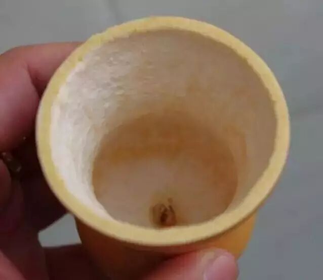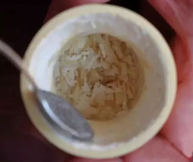 图四、图五及图六:选择合适的长柄勺子,刮除二分之一的里子(里子格外厚的葫芦,可适当多刮除一些,最多不可超过三分之二),切记不可刮得过狠,尽量不能露胎(露出胎质部分呈淡黄色,在里子最底层的下面);蓄养阴虫(黑白虫等)的葫芦,底部的里子可适当留得比侧部稍厚一些,可以有效的防水,防止养虫过程中由于涮水造成的阴底。