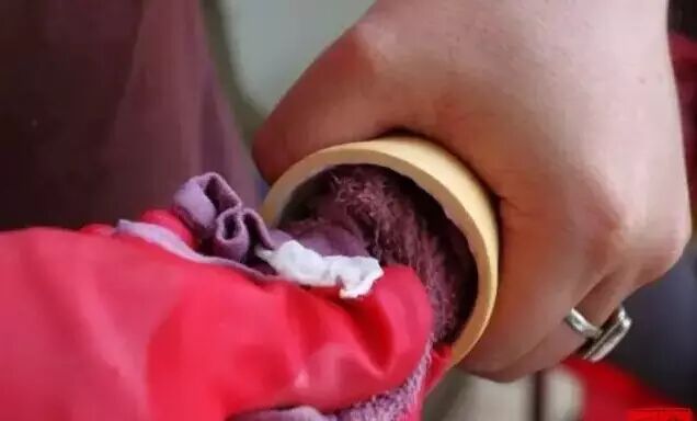 图十:将湿毛巾趁热用力塞进葫芦内,塞实塞紧,用力旋转1-2分钟左右,随后用力按压着旋转取出毛巾。