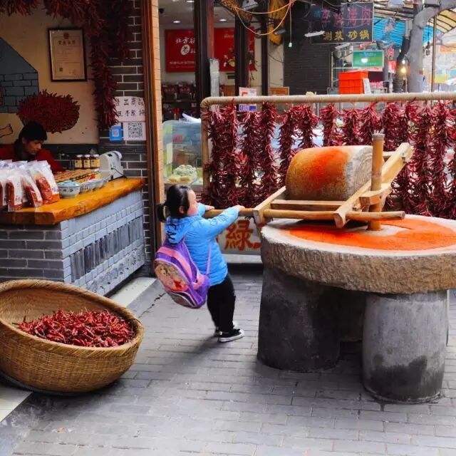 ▽成串的辣椒被挂在栏杆上,刚放学的孩子拉起了碾辣椒的磨