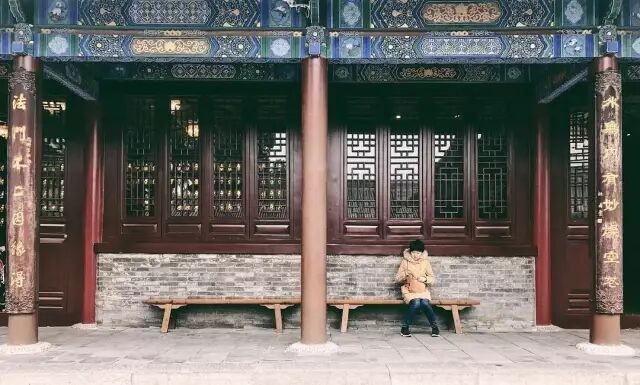 ▽朱红的墙墨黛的瓦,三两枝树杈挤入镜头