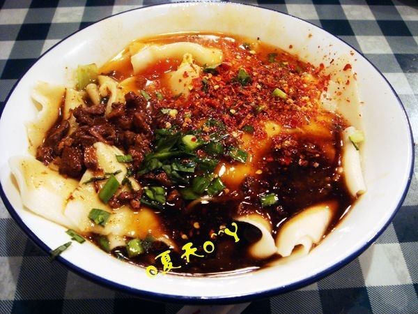 然后放上盐、醋、特制的调料水、豆芽等,最后用筷子挑起一撮皮子在辣椒油里美美一蘸。红红的,油油的,一起淋到皮子上端到食客面前,不等入口那扑鼻的香味就已经谗的人口水直流了。