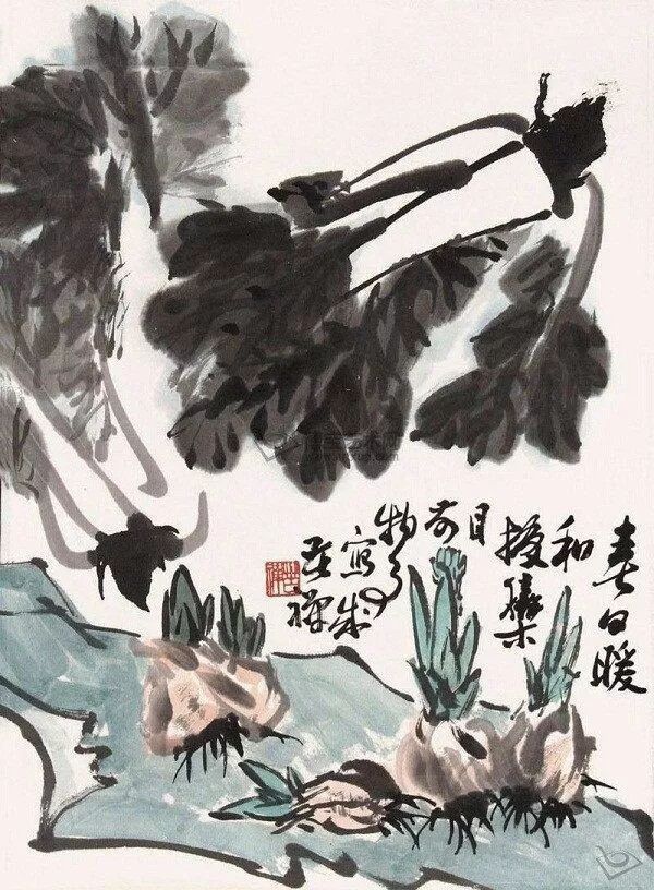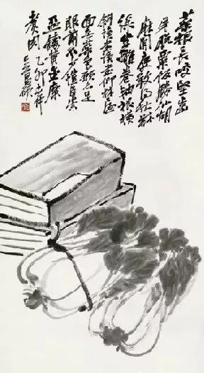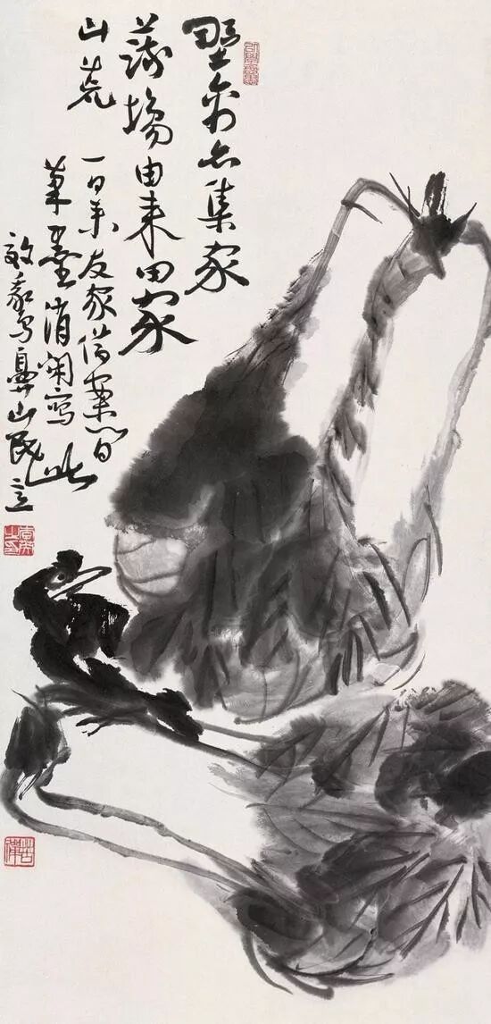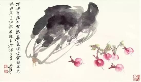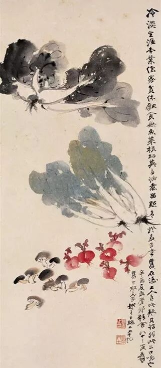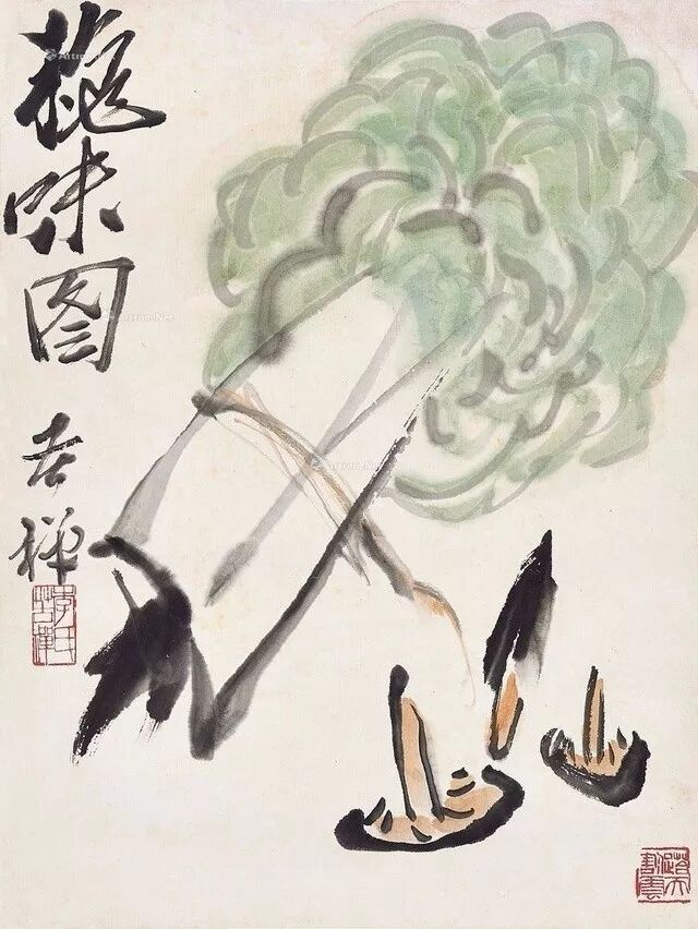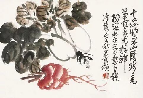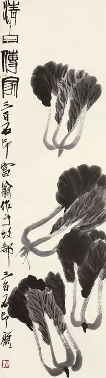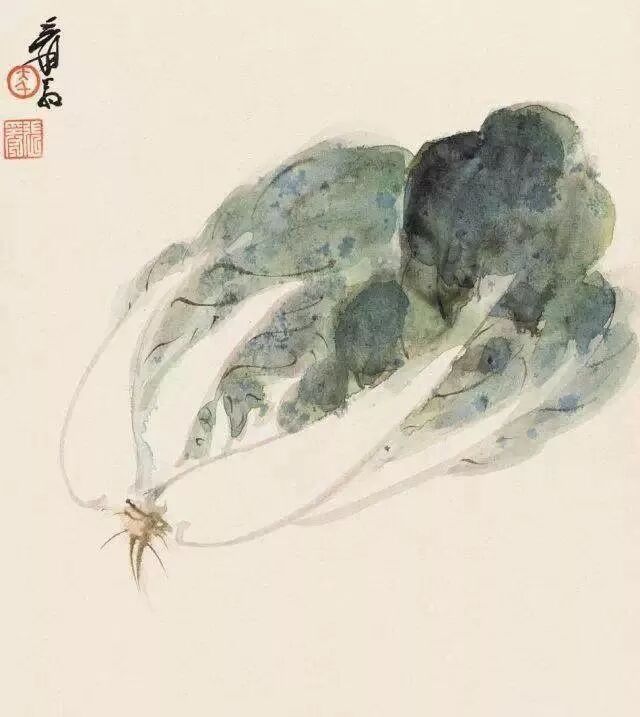 清末大画家吴昌硕笔下的白菜追求大气,常以淡墨写帮,浓墨写叶,构图极简洁,他曾在画上题款“咬得菜根定,天下何事不可为?”画与款升华出一种人生哲理。