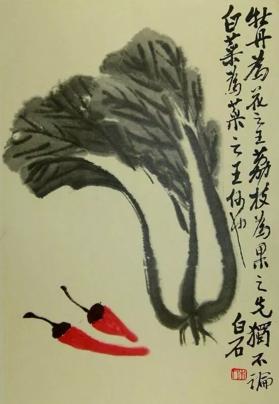 白石老人曾经画过一幅大写意白菜图,画面上点缀着鲜红的辣椒,他题句道:“牡丹为花中之王,荔枝为果之先,独不论白菜为蔬之王,何也?”