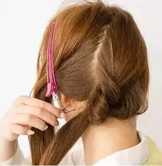 step4:将中间的头发扭转到下面的头发上,用发夹固定到扭转的地方。