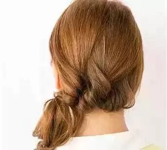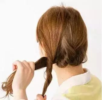 step5:将头顶的一束头发放下后进行扭转,将第三束头发拉到下面。