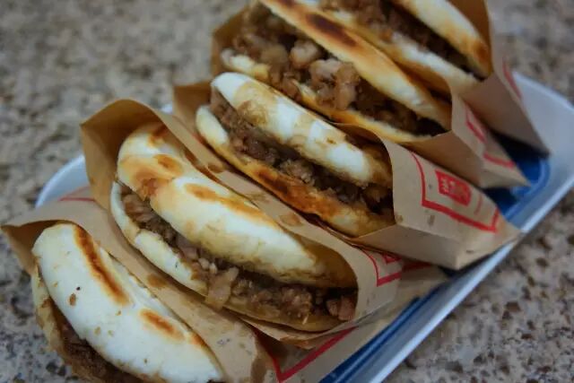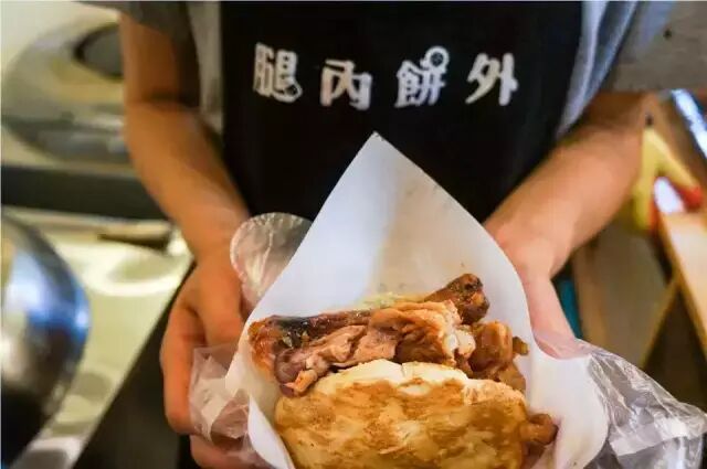 鸡腿拆骨后切碎夹入烧饼,咬下去鸡肉香嫩多汁,鸡皮渗出的油脂发出诱人的光芒,鸡肉的嫩加上腌料的香配上酥脆的烧饼。一口入魂!
