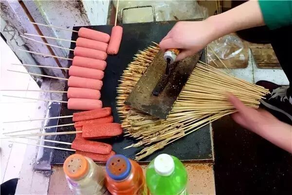 他家的烤香肠也很好吃,香肠两面煎,在老板亲手的烹饪下发出孜孜的响声,别提有多香了。
