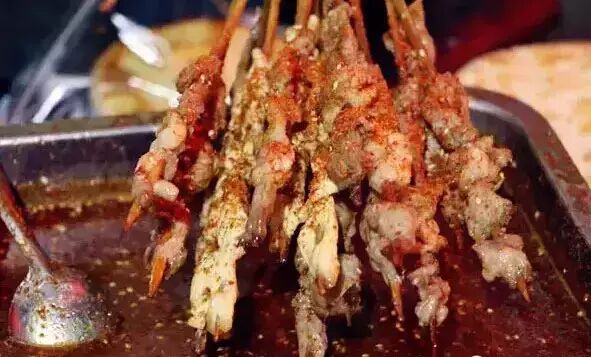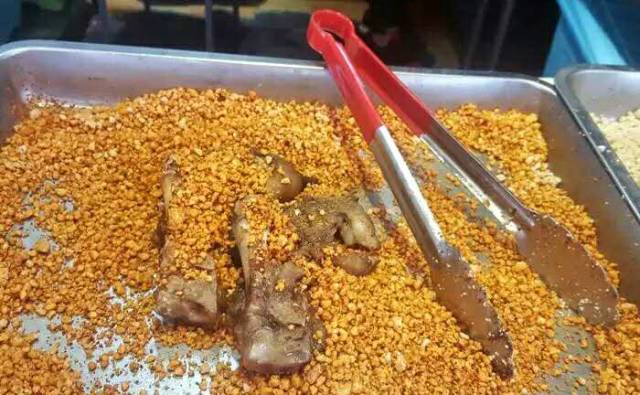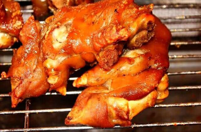 猪蹄煮熟了再烤,辣与不辣的猪蹄烤的外焦里嫩,外面再裹上一层花生酱,香而不腻。