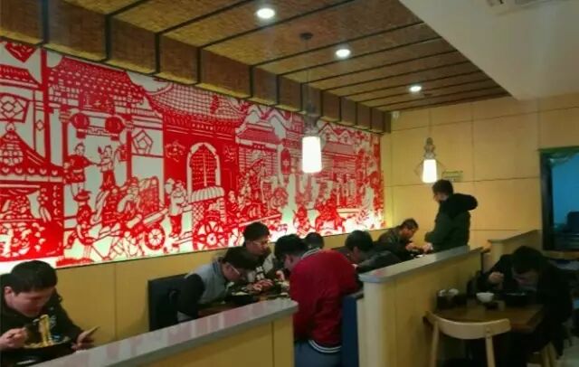 店内布置的很有味道,墙面上的大幅剪纸还原古代人民的生活场景。