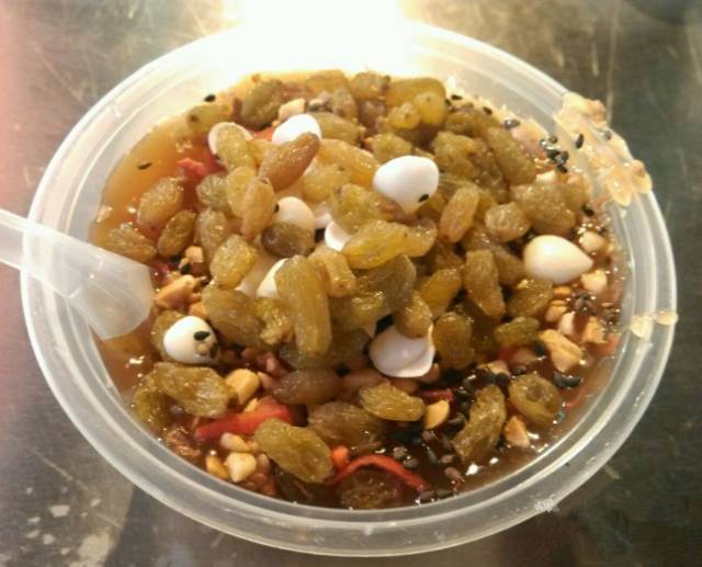 他家料很足,杏仁花生芝麻葡萄干青红丝,给的足足的。味道吃起来甜甜的,而且他们家加的还有玫瑰酱,整个杏仁茶吃下去可谓香甜十足,丝毫不腻。