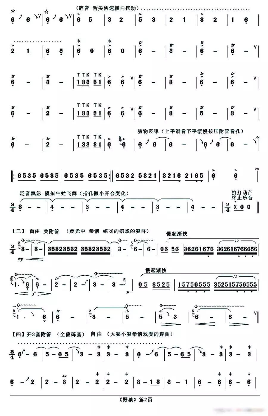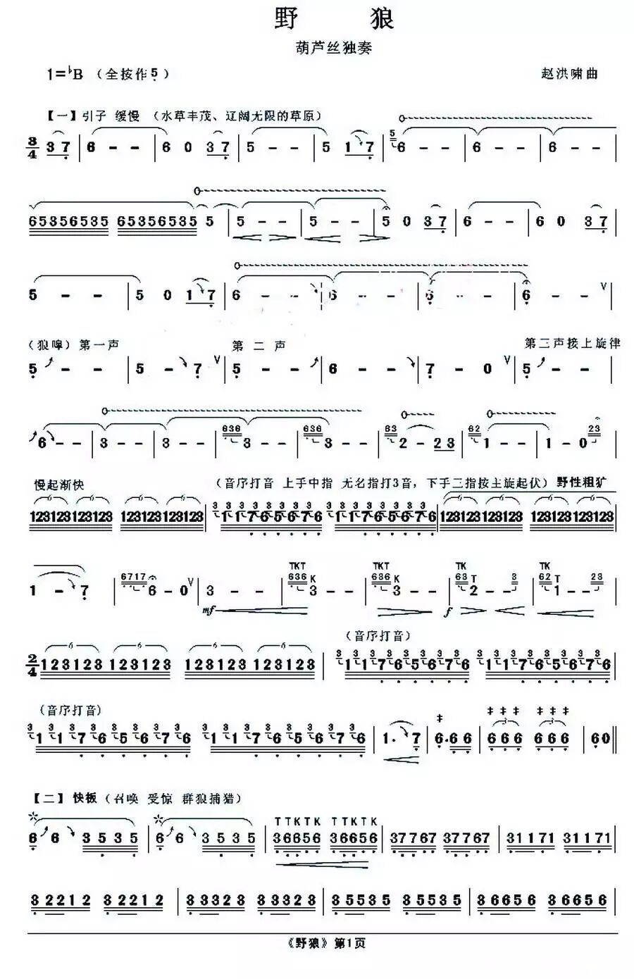 《野狼》以三管(三重音)降B传统葫芦丝演奏。