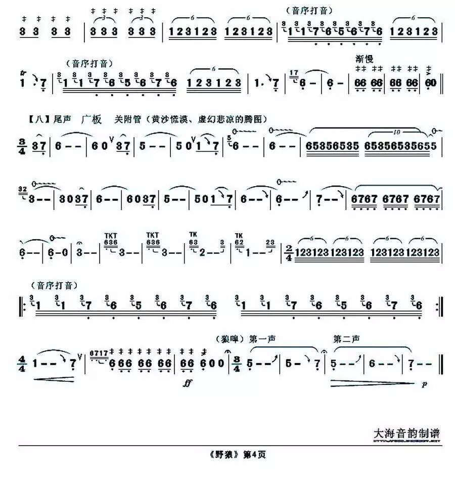 第六段“狼的悲恸、哭泣”——大跳度下行的近似剁duò音,模拟哀怨无助、回肠欲断的孤狼哭泣。随后第七段以双音、音序打音表现野狼绝望无助、奔走荒原。野狼绝望地奔跑:有力量却没有猎物、奔跑却没有方向的悲凉......