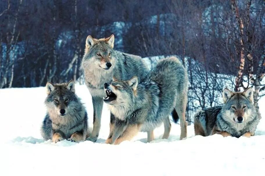 紧接着以双管、碎音技巧吹奏的第四段,是狼群嬉戏玩乐的欢快舞曲。当音乐发展到顶点时,旋律戛然而止。