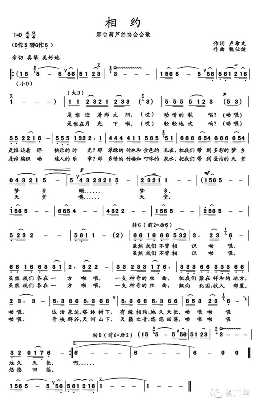 我们相约在葫芦丝这片鲜花盛开的园地里,享受着阳光,享受着音乐。我们尊重和感谢所有葫芦丝大师们为我们创作了这么多好曲子。随着时间的推移,有些曲词,可能会被人们渐渐忘去,但一个成功的词曲,应该是有着永恒的生命力的。我们更有理由相信,这首《相约》,一定能成为我国民族乐曲中的又一支奇葩。