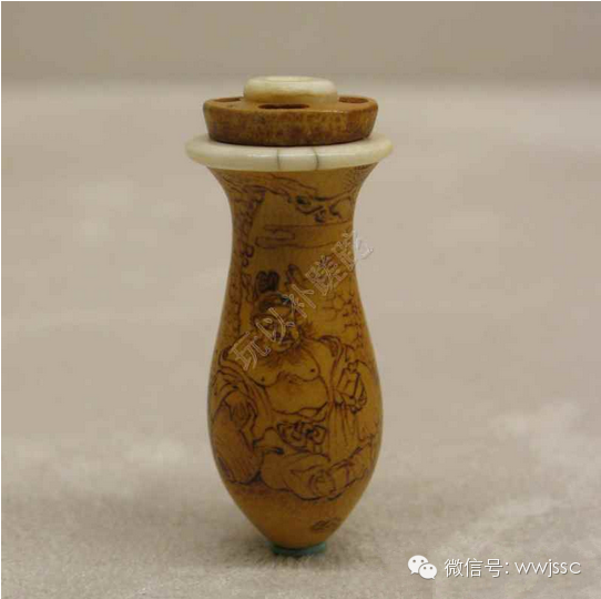 此外,手捻葫芦亦可施以砑花、火绘等技法修饰,甚者还可经由模具范制,与虫具葫芦无异,但期间别有一番韵味。更有甚者,将手捻葫芦中器型较佳的裁剪成器,亦按虫具装配方法,配以口圈、口盖、蒙心等物,虽手捻器型过小无法蓄养鸣虫,但可颈系腰佩,掌中把玩,别有情趣。亦可搜集陈设,不失为葫芦收藏中另一番乐趣。