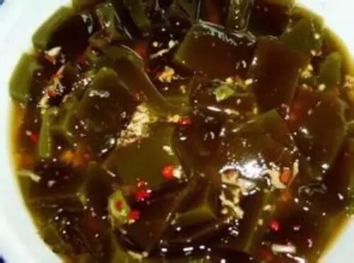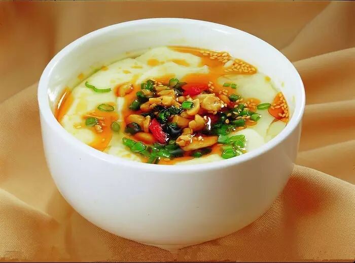 桐柏豆腐脑,又叫老豆腐,用糖饧起色,加火烧开后,加入湿粉芡,放入泡好的油粉丝,加豆腐脑适量,葱盐椒调味。色泽金红透亮,质微稠,舀入碗中再加入海米、海带丝、金针、韭菜丁、胡椒粉,淋点芝麻香油,浓香无比。泡食饼馍麻叶是当地人的喜爱。