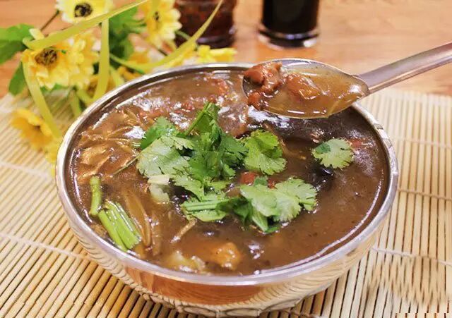 邓州胡辣汤,又称糊辣汤,历史悠久,三国时期,曹操偶然品尝到了这种又糊又辣的汤食,大加赞赏,遂亲将其命名为“糊辣汤”。邓州胡辣汤配料较为简单,主要以鲜肥羊肉、面筋、面糊为主,杂以大葱、生姜、花椒、胡椒、辣椒、茴香、金针菇等二十余种菜蔬佐料。色褐味鲜,食前稍滴几滴小磨油、老陈醋,更是异香扑鼻。