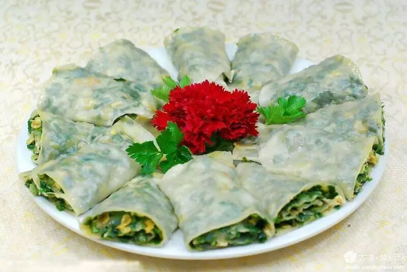 内乡卷煎又叫菜莽,是将死面擀成薄皮把馅匀摊其上,卷成筒状,两手各持一端,往中间一挤,使面皮起皱,上笼蒸熟即用。其馅有:韭菜、干萝卜丝加肉、粉条;素:韭菜、红薯叶、灰灰菜、干萝卜丝、茄子、南瓜丝加粉条。