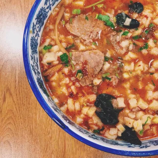 羊杂汤鲜香暖胃,大个的羊头有压倒性的震慑力!羊的心、肝、肚、肺铺陈开去,真是一点没浪费。