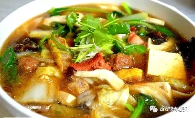 1、豆腐烩菜泡馍主要原料有:油炸豆腐、丸子、粉条、豆腐干、鹌鹑蛋等