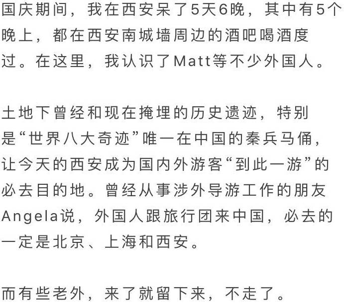 “西安有意思的地方,一方面在于它是一个本身很古老的城市,另外,尽管这个城市如此之大,它还是有一个比较小的外国人社区。我在西安见过来自全世界各个大洲的人,可能就只差南极洲了。跟他们聊天,做朋友,我会感觉自己也好像去过他们所在的城市,做了很多次不同的旅行。”