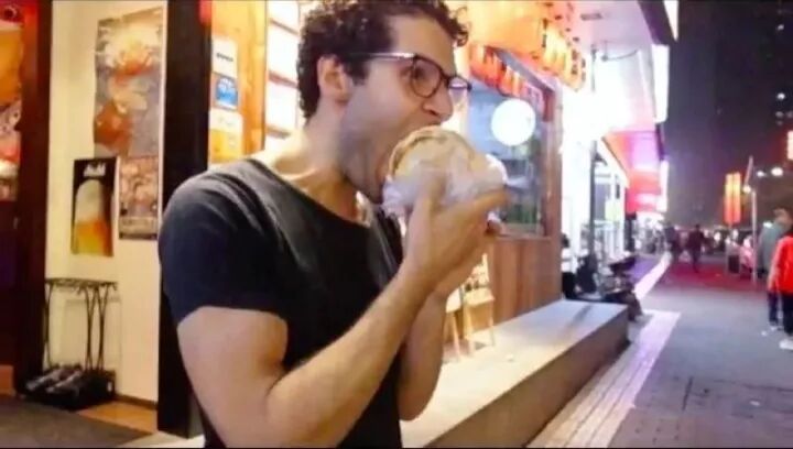 Hamoon在吃肉夹馍,截图自Ekam和Hamoon的第一条视频“how to eat chinese hamburgers”