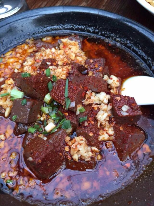 辣子蒜羊血,羊血切得很大,上面沾满了辣椒水和蒜泥,淋上热油,再加点醋,吃着满满都是蒜辣香味儿。
