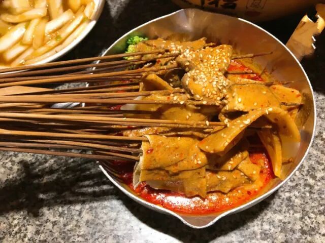豆皮涮牛肚,经典的撸串,牛肚很爽口,豆皮中规中矩,还有配菜香菇片和西兰花菜,酱汁加了非常多的孜然粉,口味比较重。