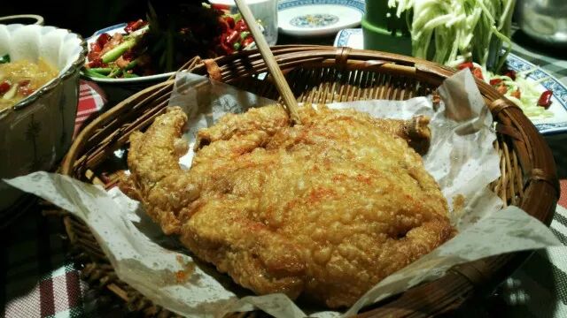 长安葫芦鸡,炸的很到位,外酥里嫩,不腻巨好吃。一整只鸡用纸包着,配上一小碟辣椒面蘸着吃,光吃皮就很满足