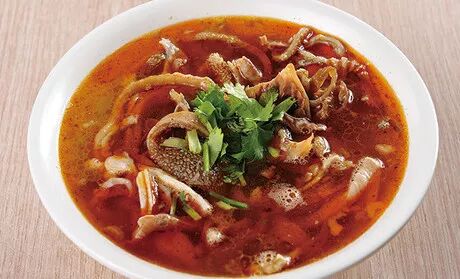 羊肉汤放入少许花椒加热,放入葱姜蒜末,放入各种切好的熟料,略煮片刻放入适量盐和味精,盛碗撒上蒜苗香菜,放入羊油辣子即可