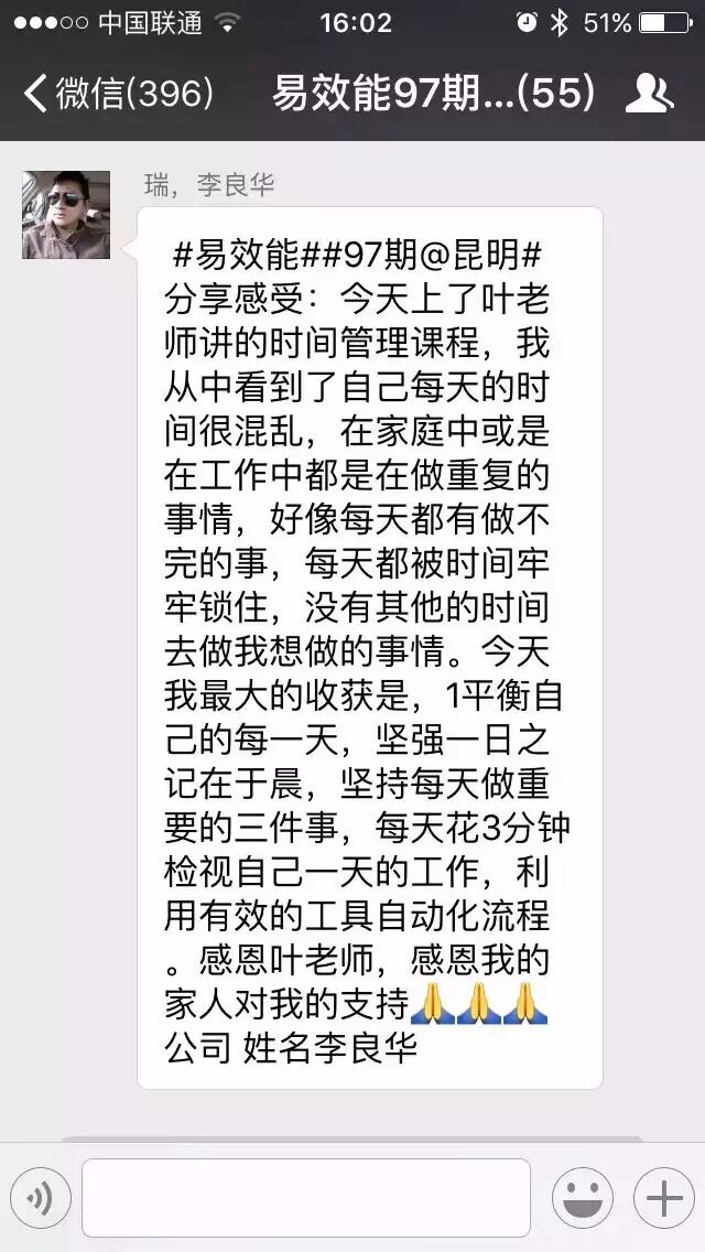 8.父母的高度是孩子的起点,为人父母,为人子女,为人妻,为人夫,均是家庭的一个榜样。当您的家庭开始践行易效能的生活方式,孩子自然就会跟您一样:生活习惯,学习习惯都好,健康不用你挂心,学习不用你操心。您要知道,时间管理课程课堂学员里,最小的是10周岁,最大年纪的学员是73岁!