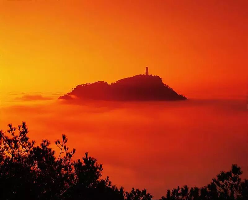 浙江 天台  这是小编家乡的赤城山,赤城栖霞属于天台八大景之一,因赤城山形如雉堞,岩色赤赭,晴天的早晚时分,尤其到春分时节,太阳升起的时候,红日高照,并且霞光会在赤城山顶的梁妃塔处停留好一段时间,形成满山紫气氤氲,霞光万道,因此把这种物侯现象称为“赤城栖霞”。赤城栖霞属于霞景中的霞光,是阳光在云雾中射出的色彩缤纷的光芒。