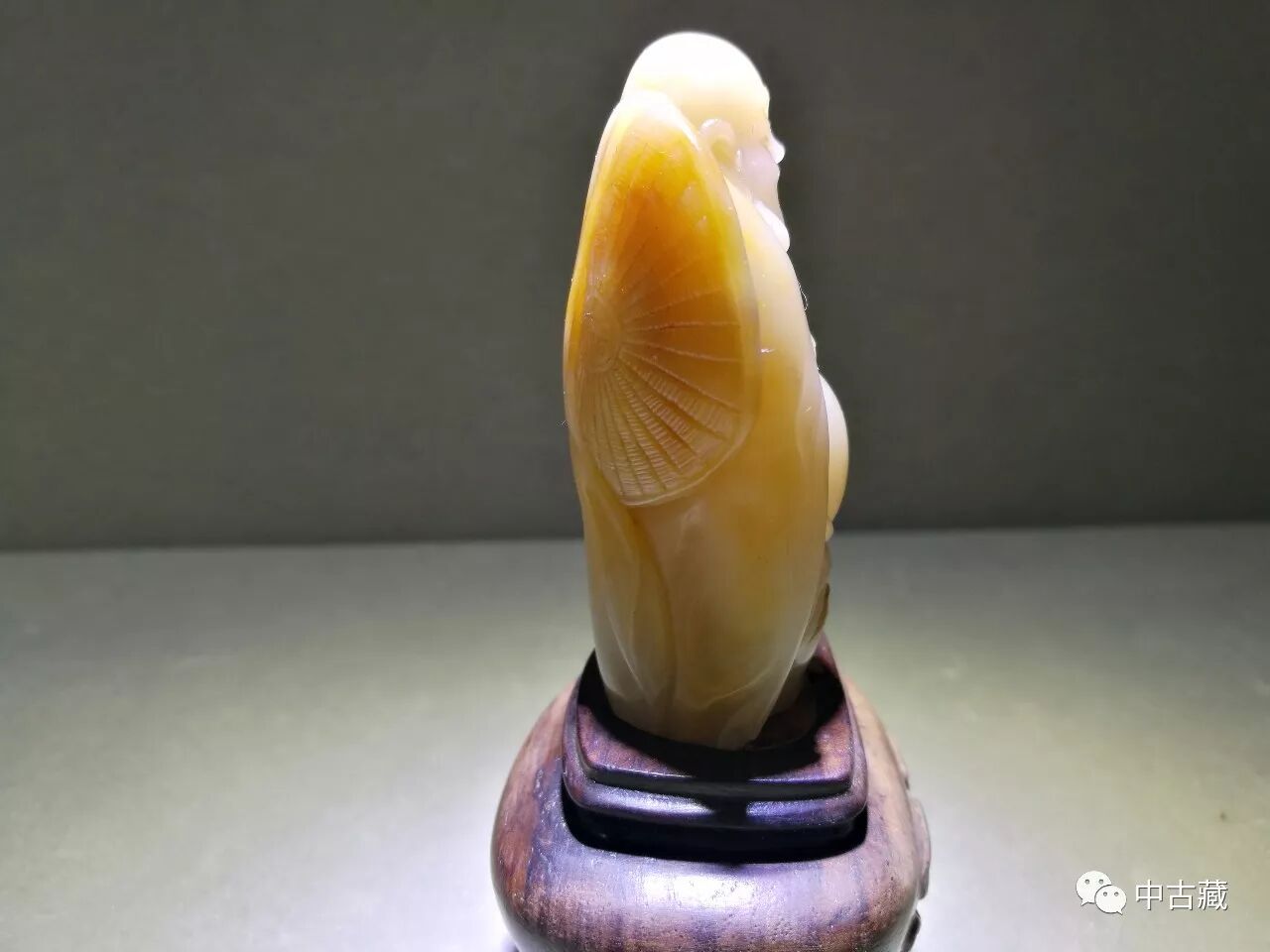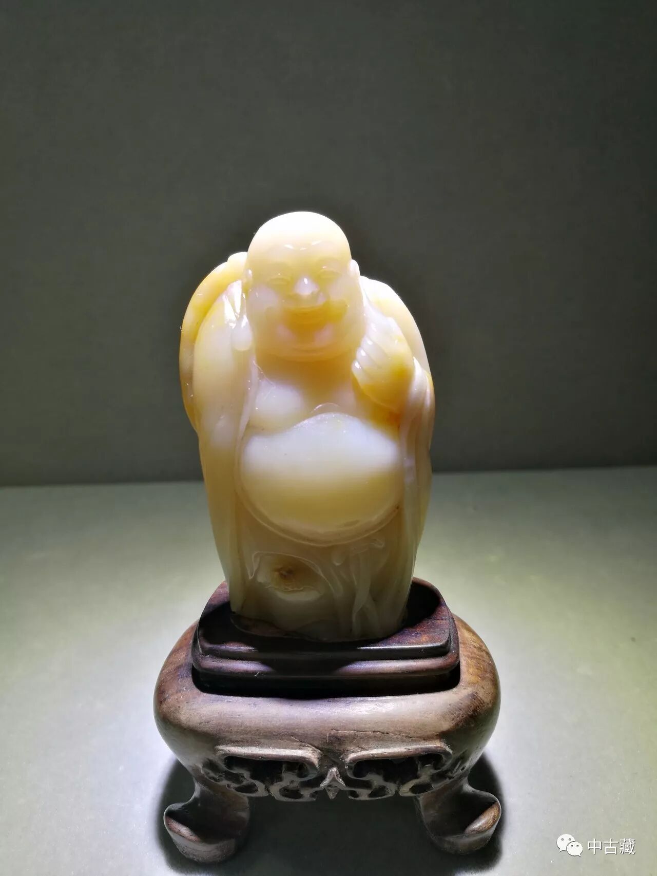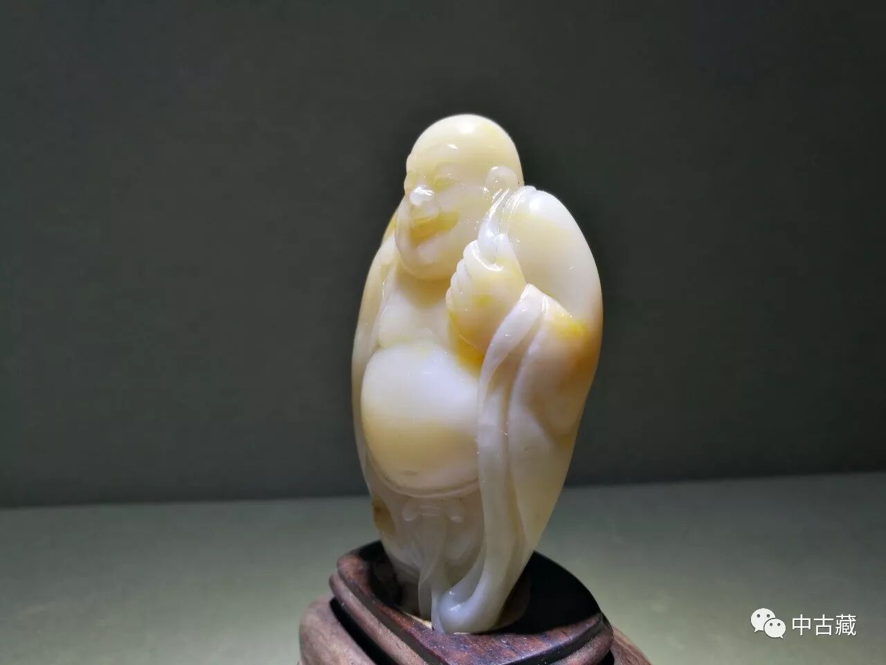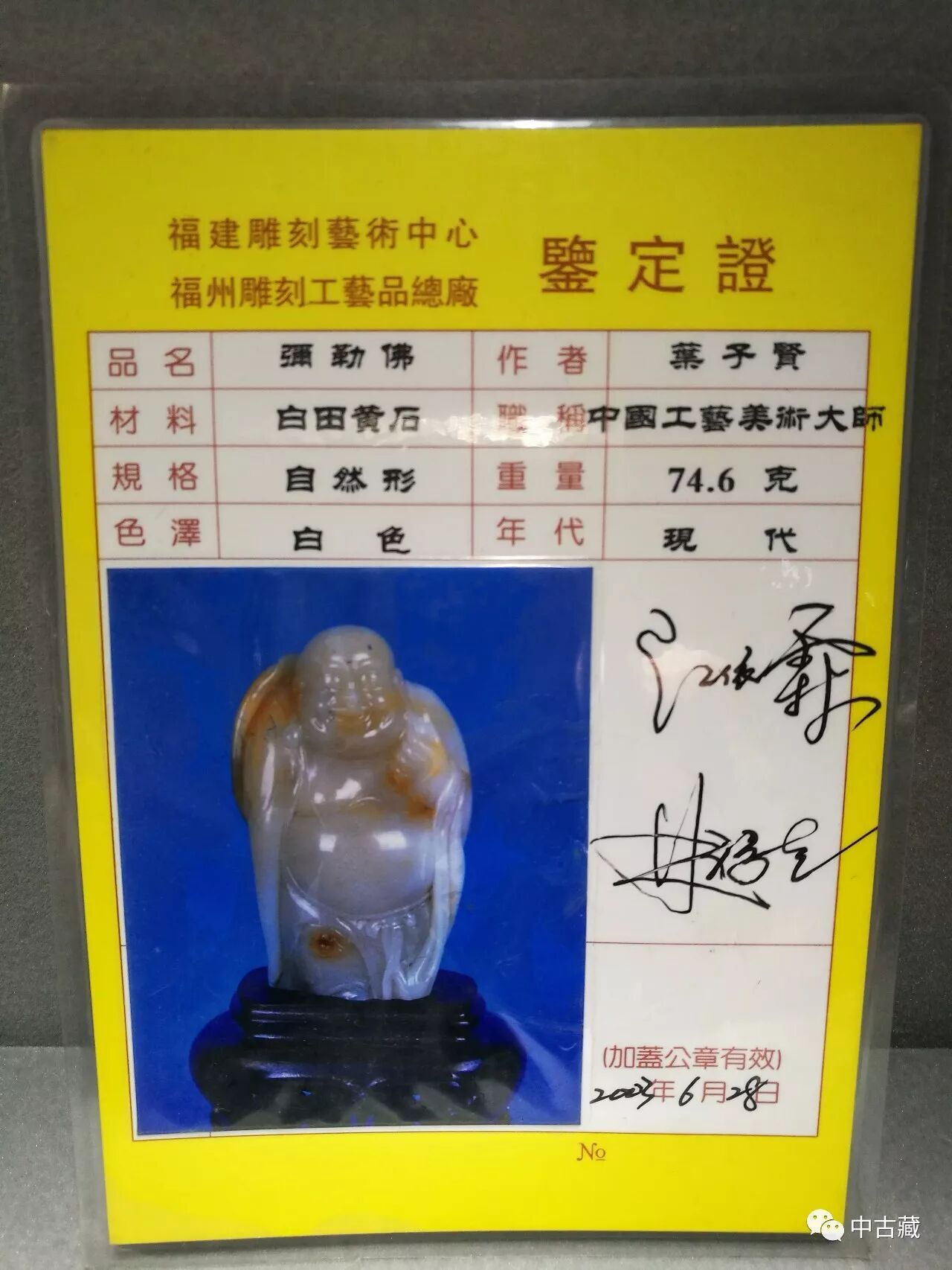 叶子贤,福建省工艺美术大师、福建省民间艺术家、中国工艺美术大师,擅长人物圆雕、高浮雕。其作品融汇木雕、牙雕技艺,作品造型别致,深得海内外各界的高度评价。此作品作者施以圆雕技法刻的弥勒佛刀工细致,细节刻画一丝不苟,展示出了作者过硬的雕刻功力。 田黄被称为“石中之帝”,中国四大国石之首,软宝石之首,只有福建寿山一块不到1公里的水田底下的砂层中才有。田黄石是中国的国宝,自古以来田黄都用做雕刻皇帝的玉玺,到现如今田黄价格一再升高至2005年以来,顶端寿山田黄的价格从5000~6000/克翻了四五倍,到达现在的20,000元~30,000元甚至到最高的200000/克,一切艺术品在到达一定高度等也许发生泡沫,但顶端寿山田黄资本有限,报价还有很大上升空间,所以对收藏田黄的藏家有很大的吸引力!