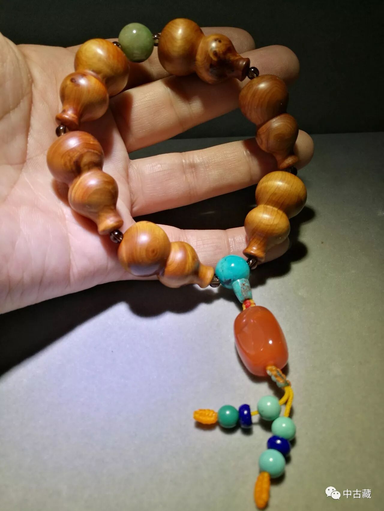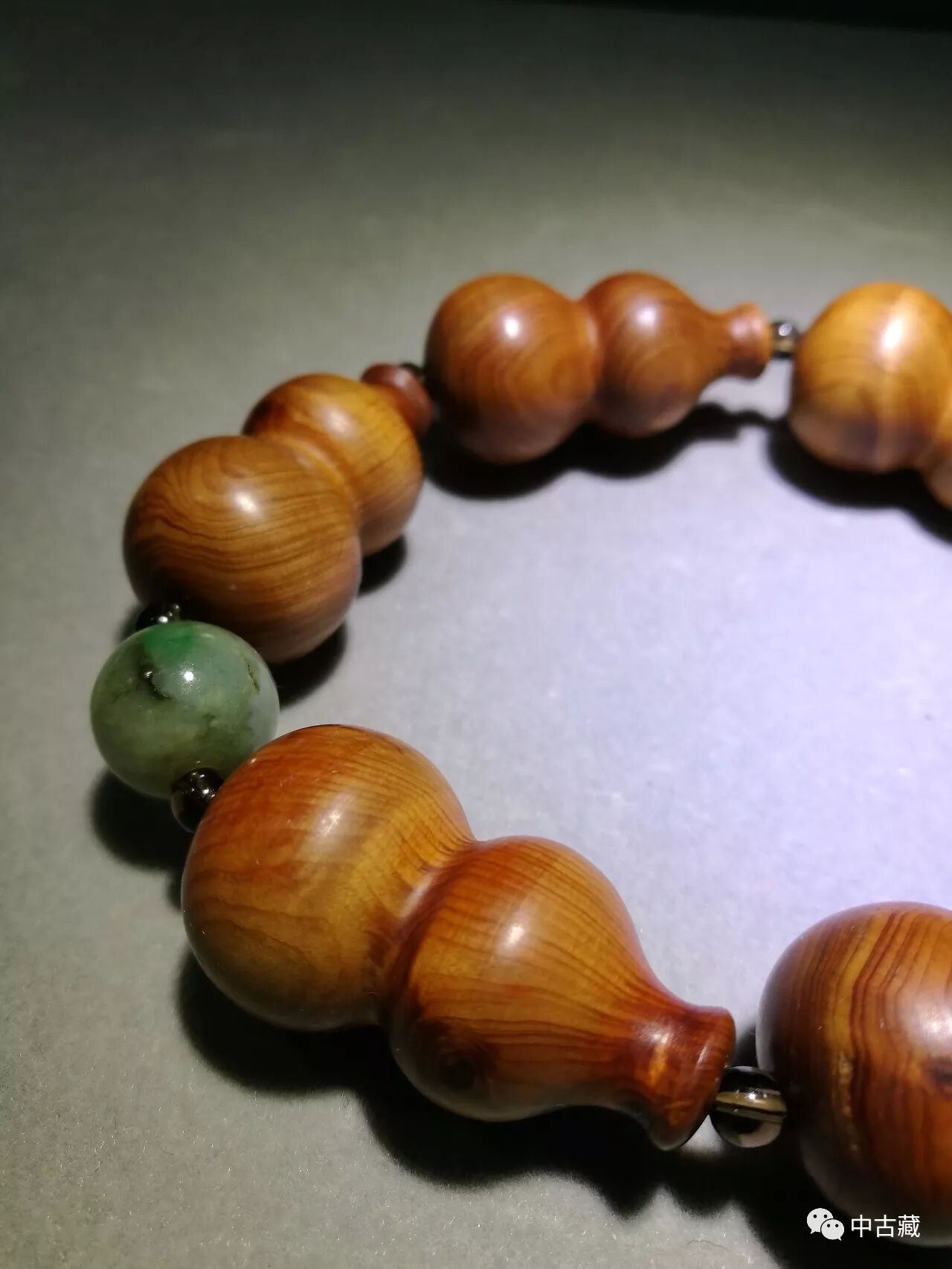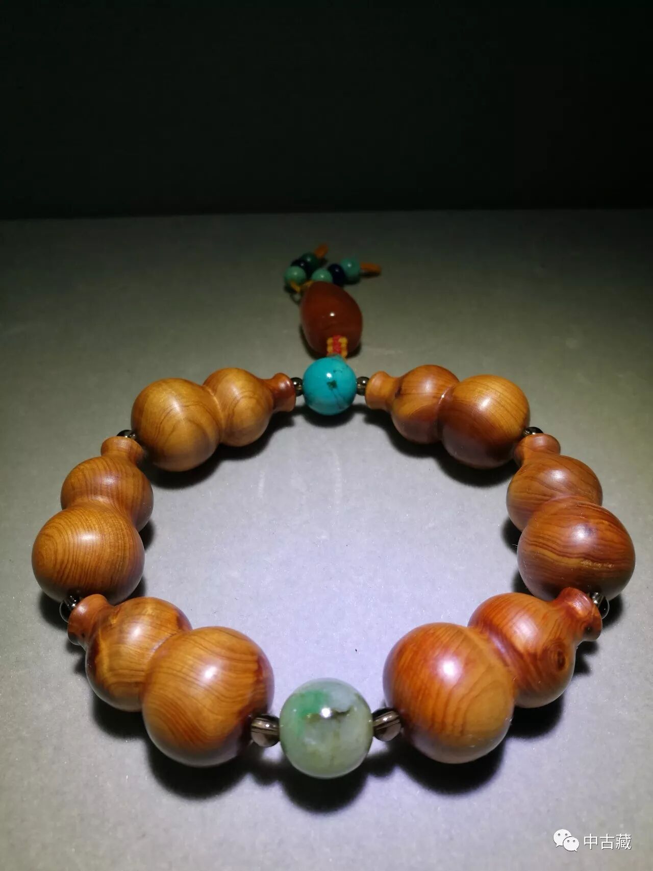 简介: 手串材质为秦岭崖柏经过5年有余的盘玩润泽透荧、影光频显。葫芦音译为福禄,六颗崖柏葫芦经翡翠圆珠穿连寓意“福禄”连“福禄”路路通“福禄”三通为绿松石,背云为南红,弟子留为松石~青金石。此手串为宝主5年来带棉布手套净盘而成,崖柏珠串盘玩这么漂亮的实属难得。