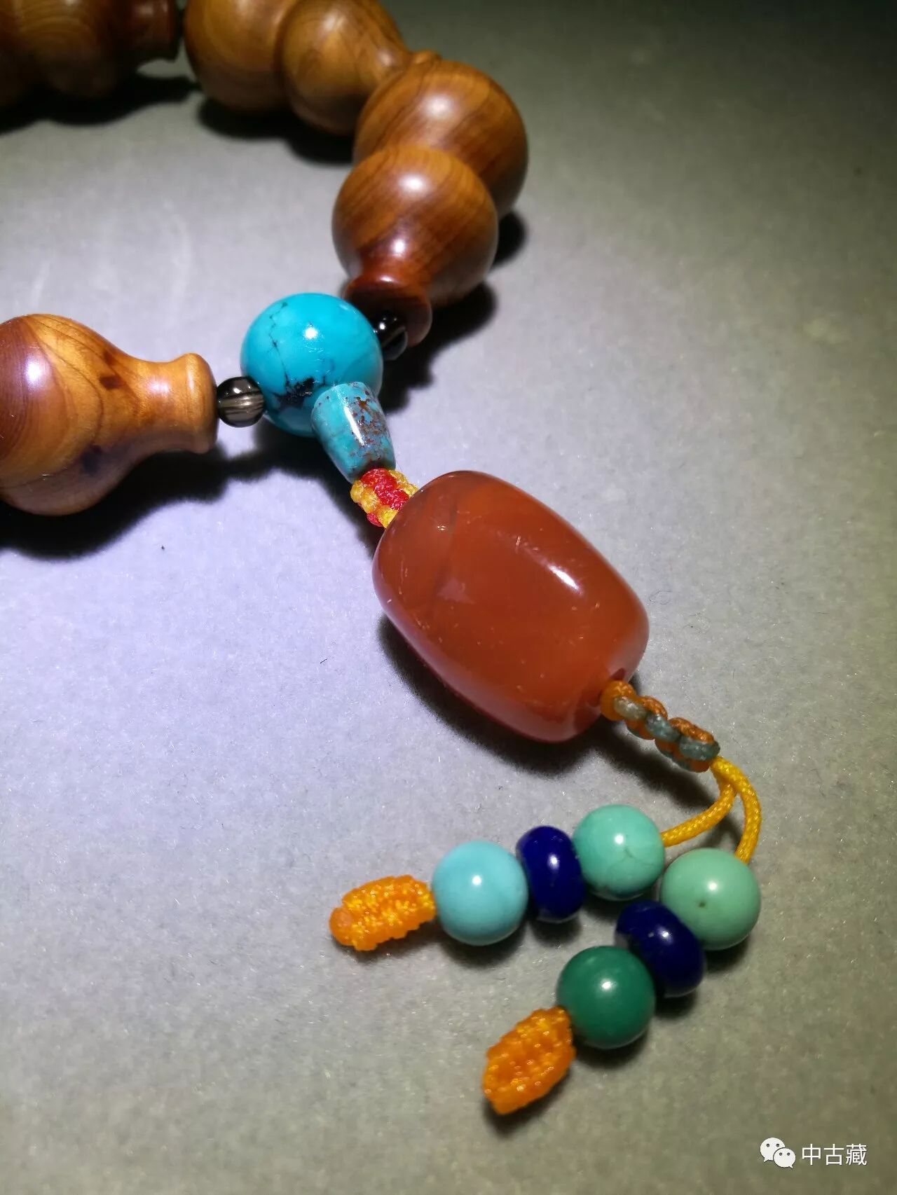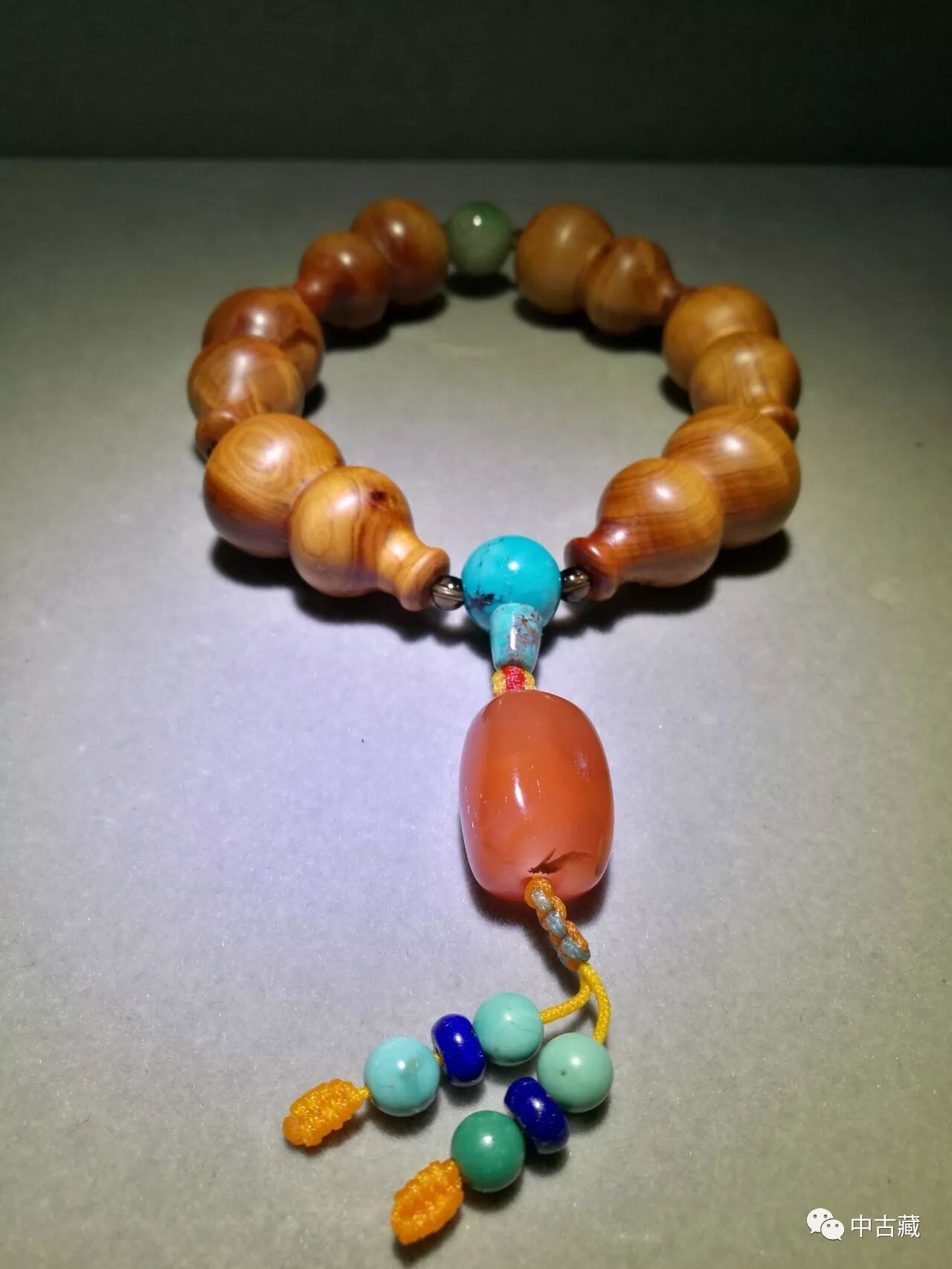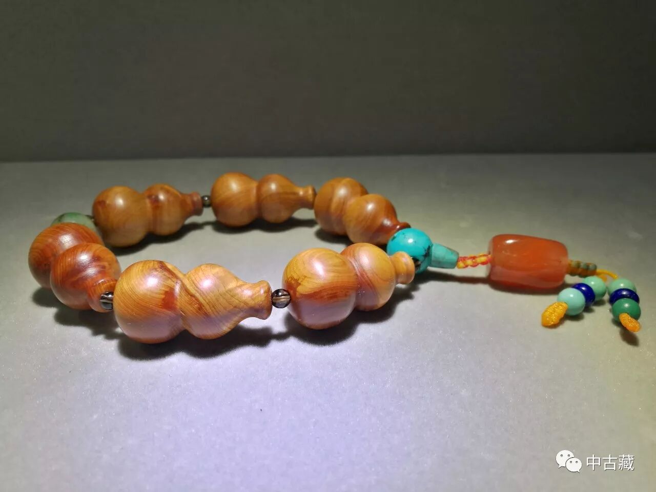 简介: 手串材质为秦岭崖柏经过5年有余的盘玩润泽透荧、影光频显。葫芦音译为福禄,六颗崖柏葫芦经翡翠圆珠穿连寓意“福禄”连“福禄”路路通“福禄”三通为绿松石,背云为南红,弟子留为松石~青金石。此手串为宝主5年来带棉布手套净盘而成,崖柏珠串盘玩这么漂亮的实属难得。