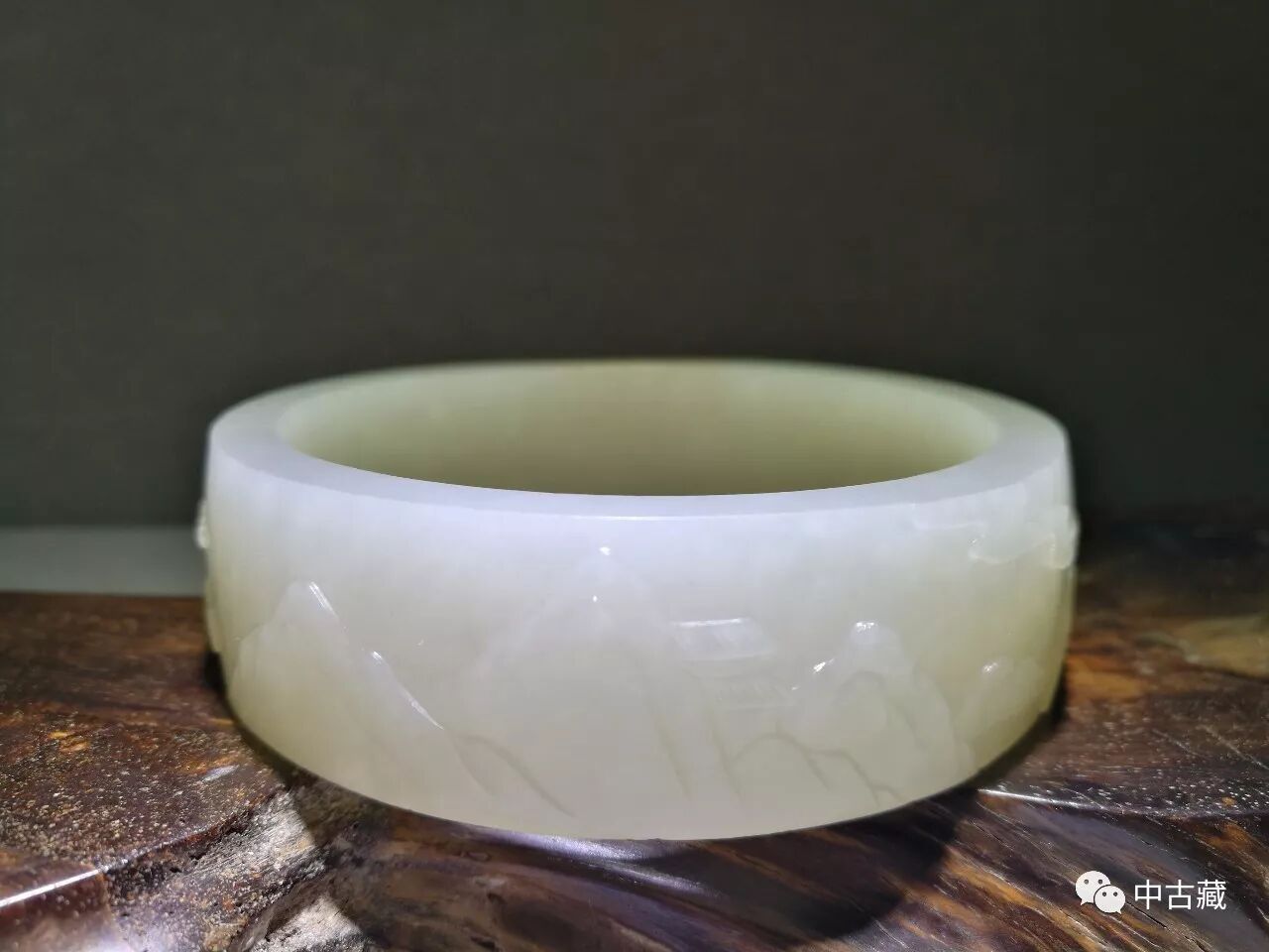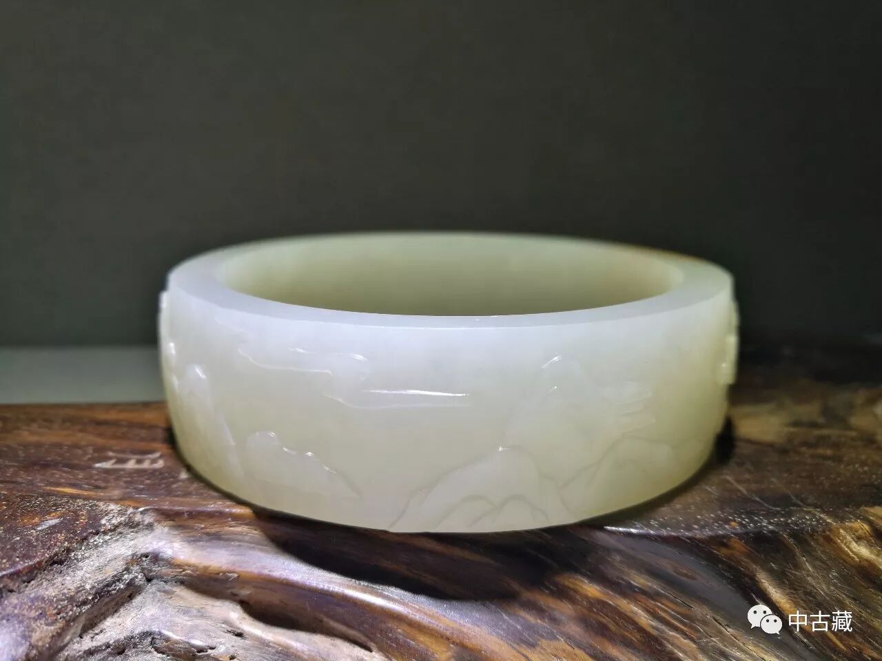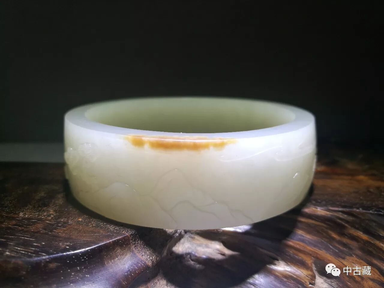 描述:此玉镯材质为和田白玉,其玉质细腻,光滑,部分留有原皮,玉镯上的画面很是清雅,远山近水屋宇藏于山间,风轻云淡颇有逍遥之感,无绺无裂,品相极为完整。玉镯表面包浆自然柔美,古意十足,玉镯雕工甚美,从包浆及器形上看,此手镯具有了较鲜明的清代玉雕工艺特征,具有极高的佩戴和收藏价值。