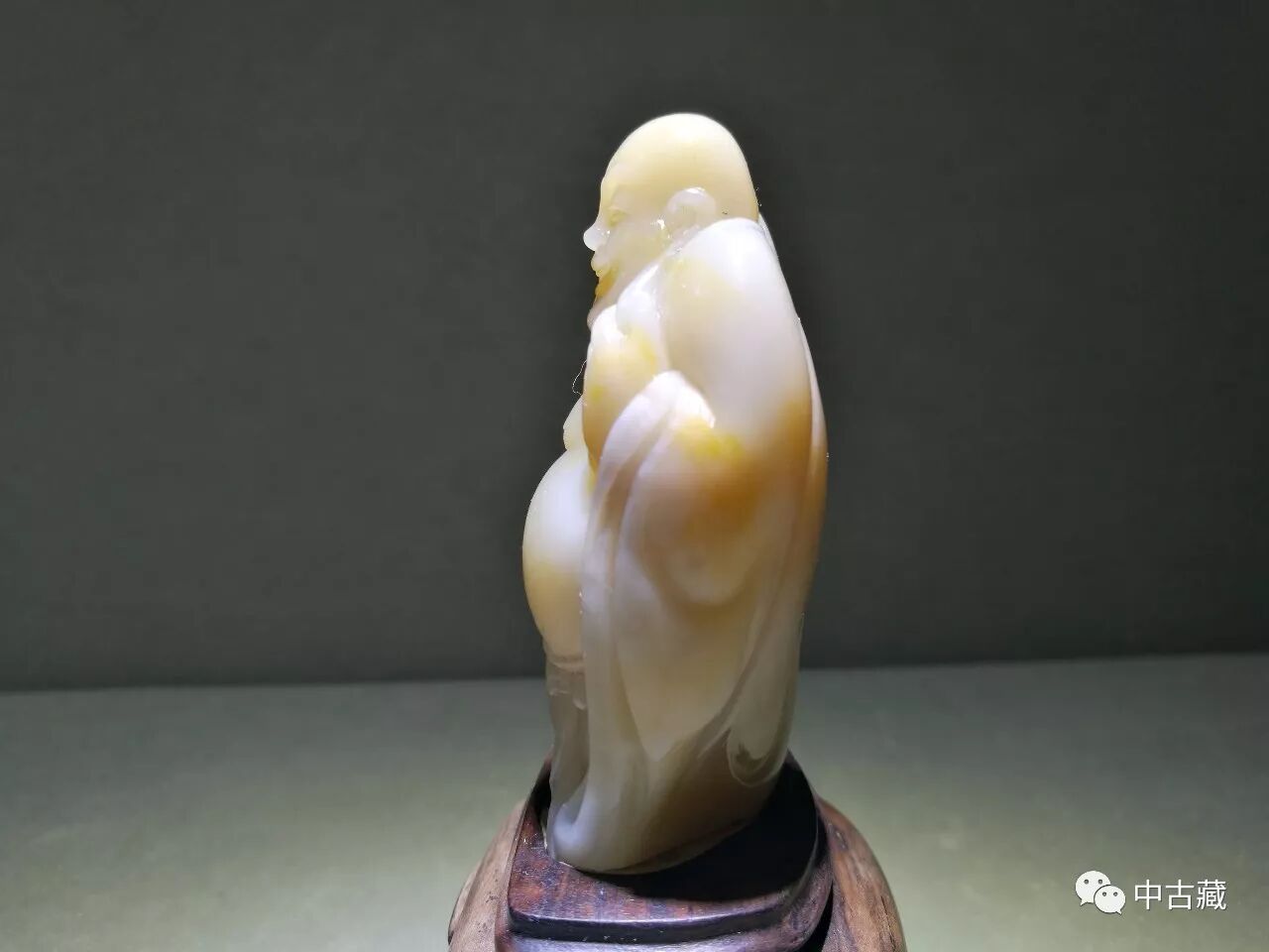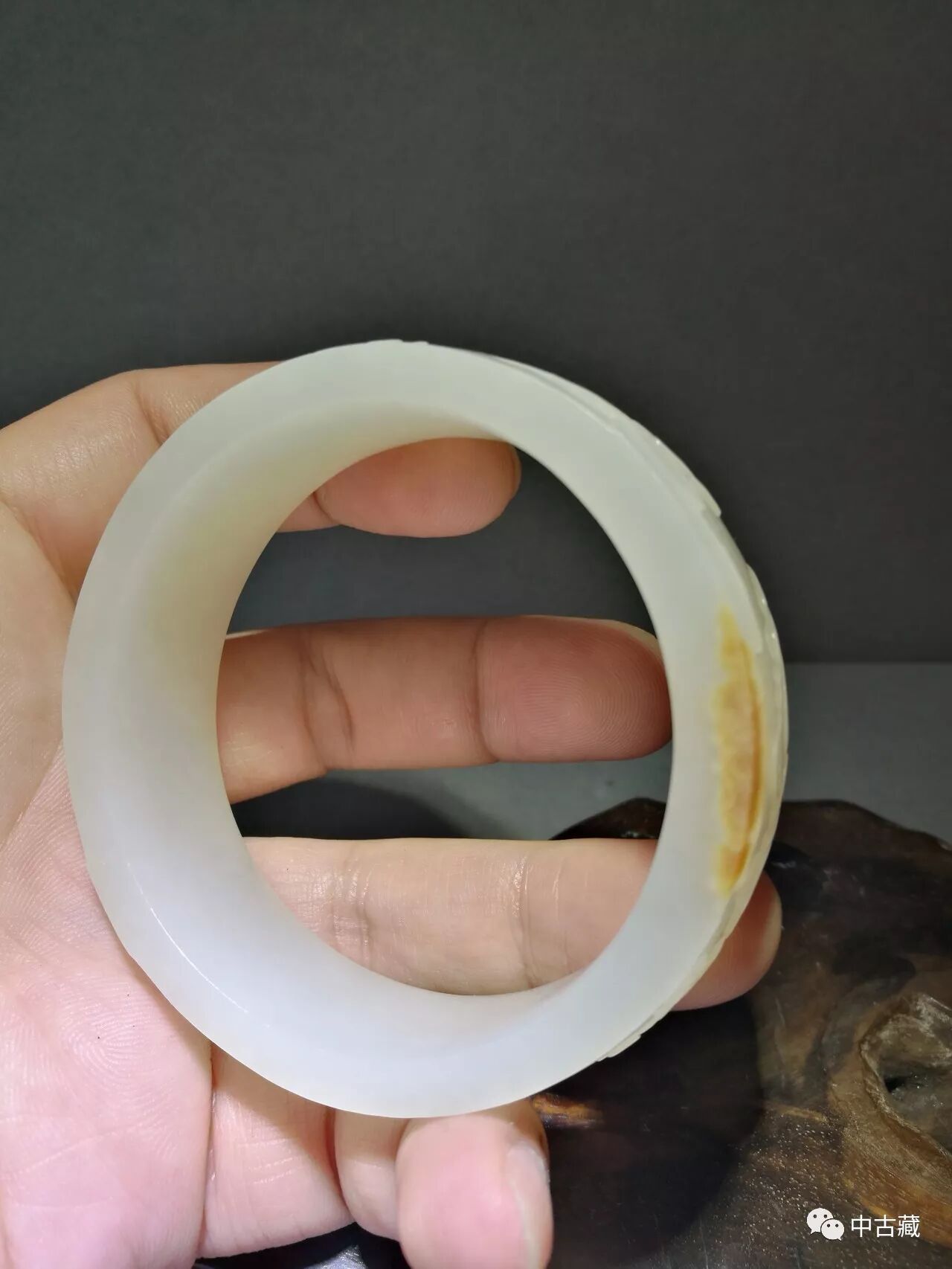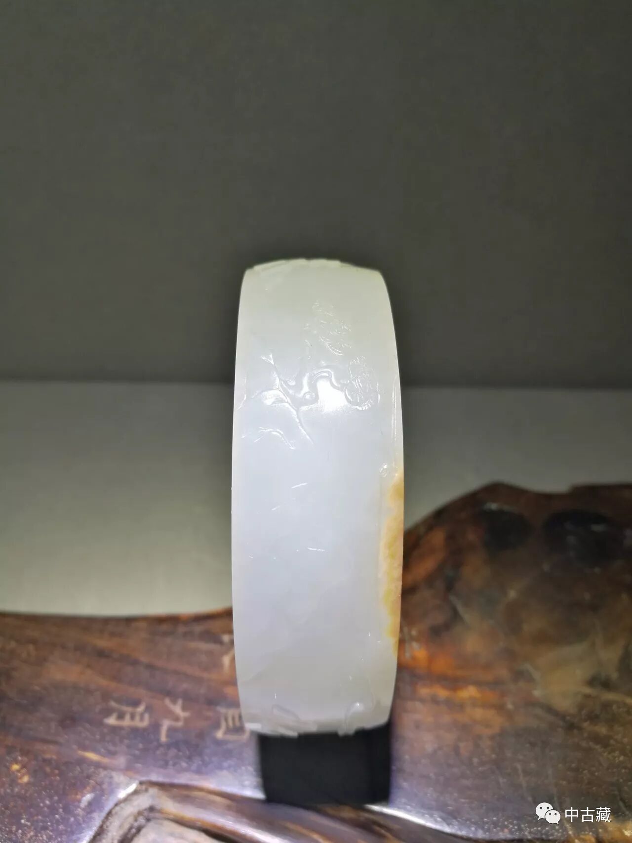 描述:此玉镯材质为和田白玉,其玉质细腻,光滑,部分留有原皮,玉镯上的画面很是清雅,远山近水屋宇藏于山间,风轻云淡颇有逍遥之感,无绺无裂,品相极为完整。玉镯表面包浆自然柔美,古意十足,玉镯雕工甚美,从包浆及器形上看,此手镯具有了较鲜明的清代玉雕工艺特征,具有极高的佩戴和收藏价值。