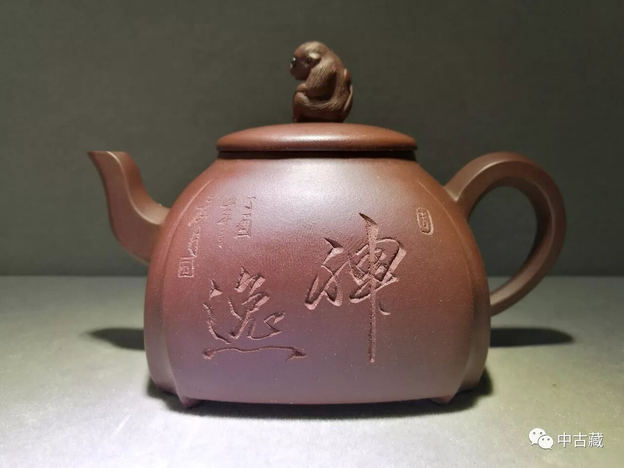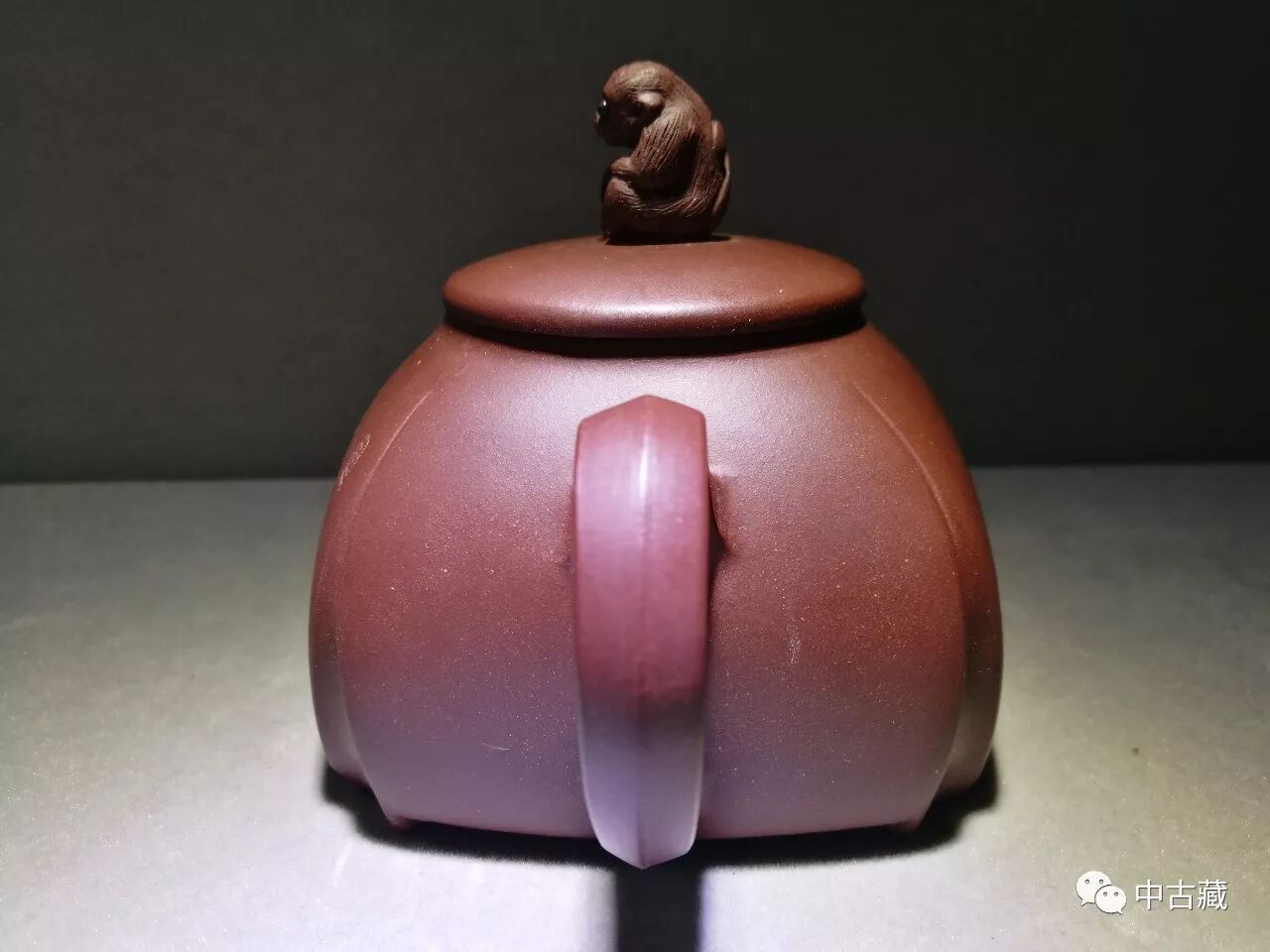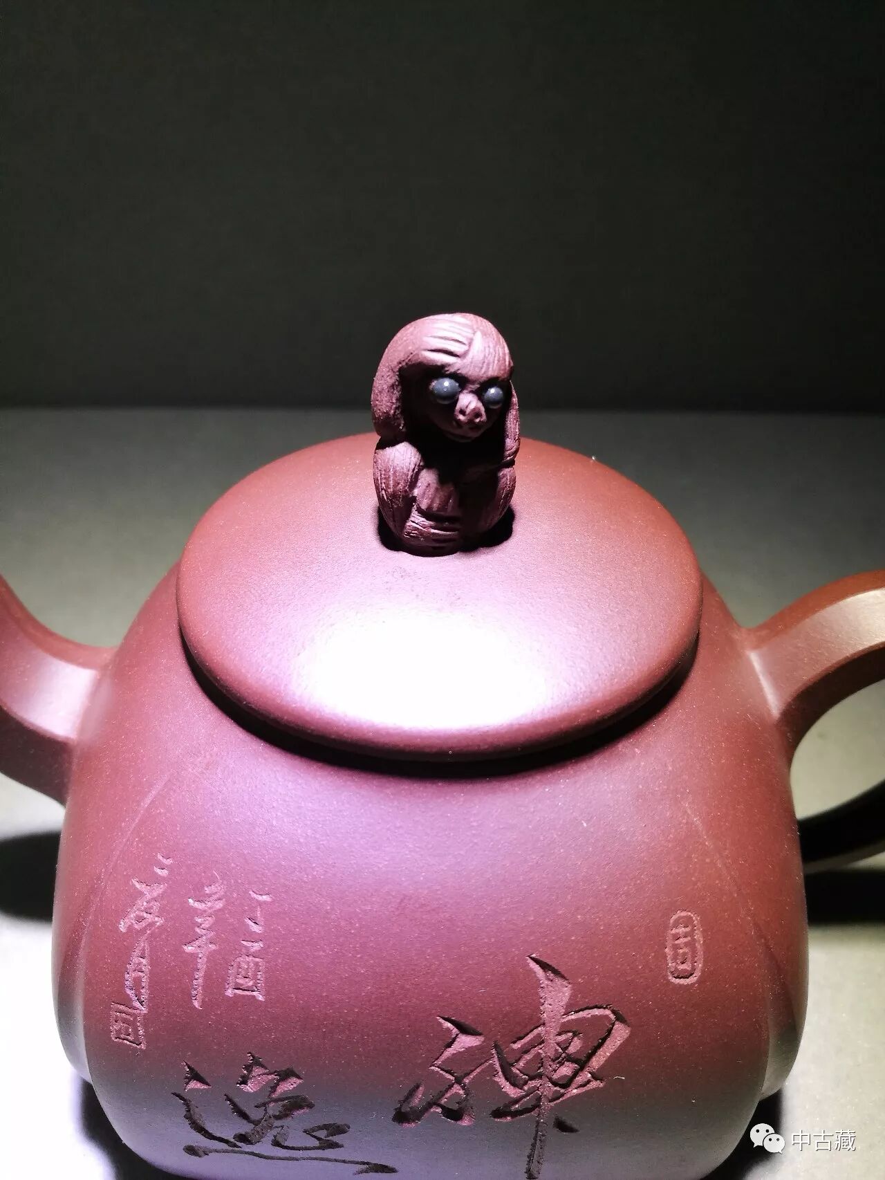 描述:作者周勤,全国工艺美术员。此壶选用上等的紫泥为原材料,此泥料泡养过后色泽鲜艳,光泽亮丽,壶体刻字笔锋钢劲有力、壶钮小猴萌态尽显,且此壶出水爽利,造型优美,很受品茶爱好者喜欢。