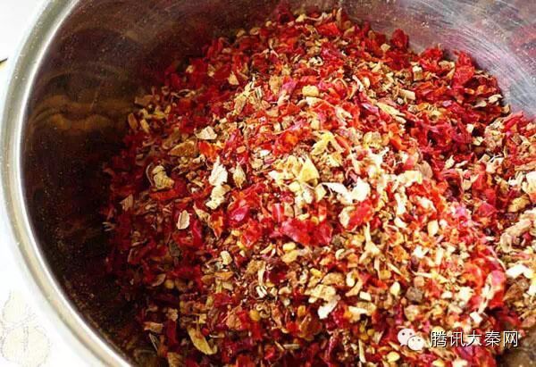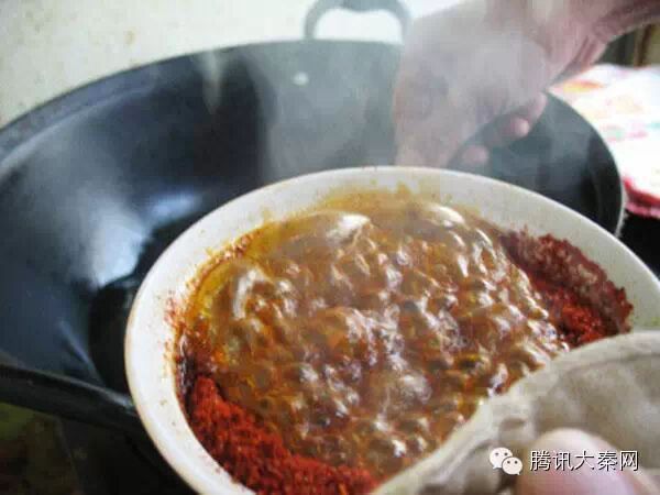 将香料配好磨碎,另将陕西红辣椒磨碎(不要磨成面面哦),二者掺合,取菜籽油若干(油一定要多放,一般都要没过辣椒好多),加热到冒大烟,关火,冷却一下,无烟了直接泼到辣椒上。(辣椒里加点盐也可以),陕西一般用这种辣椒油做凉拌,好多凉皮店视此配方如命。