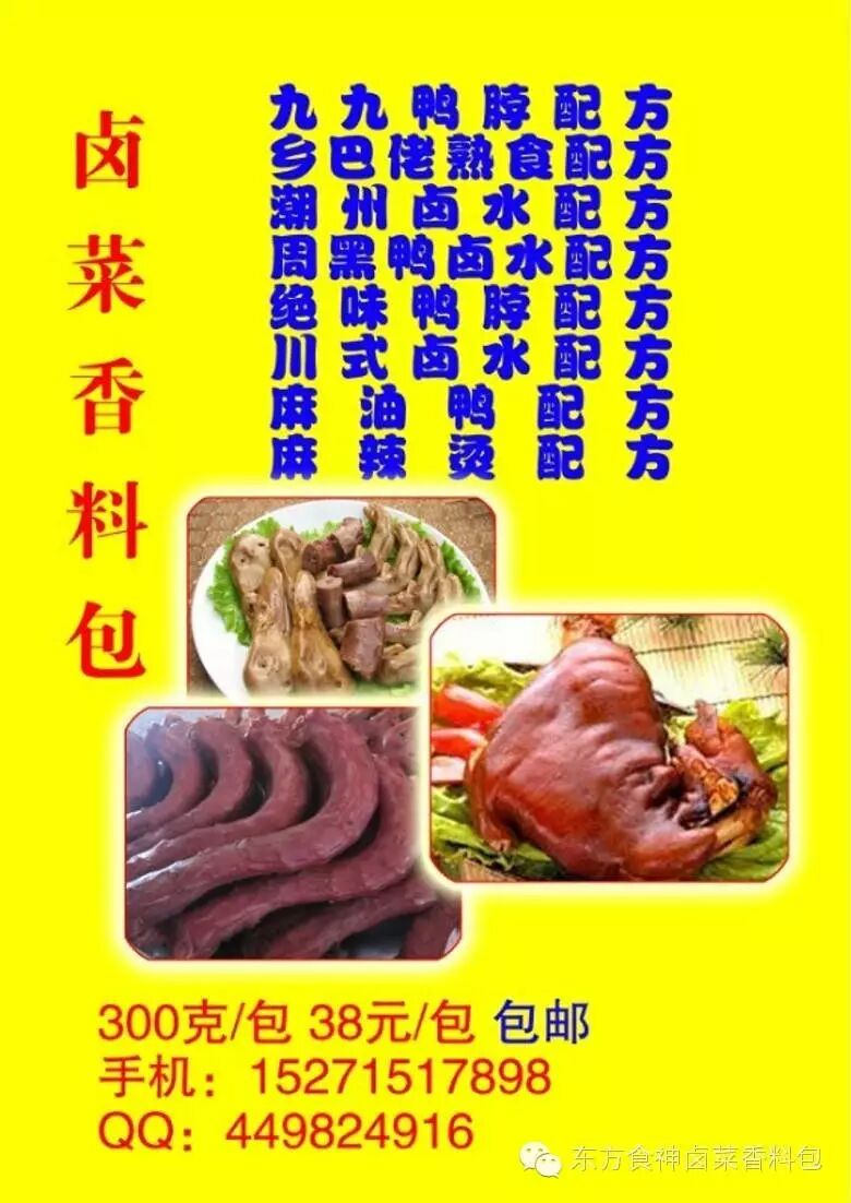 九九鸭脖,乡巴佬熟食,五香卤水,潮州卤水,武汉周黑鸭,川式卤水,酱猪蹄,酱猪头肉,德州扒鸡,霸王鸭,麻油鸡,麻油鸭,杭州酱鸭,盐水鸭,麻辣烫,单县羊汤,陕西凉皮,桂林米粉,酸辣粉,过桥米线,十三香小龙虾,油焖大虾,卤水龙虾,啤酒烤鸭,神仙鸭,牛肉汤料,馋嘴鸭,盐焗鸡,洪濑鸡爪,馋嘴牛蛙,麻辣香锅料,正宗酱牛肉,麻辣兔头,道口烧鸡,兰州拉面,牛肉板面,加州牛肉面,重庆小面,四川牛肉面,河南烩面,廖排骨,烧烤料,烤羊腿,东北酱骨头,卤狗肉,重庆鸡公煲,黄焖鸡,香酥鸡,柴火鸡,沟帮子熏鸡,海鲜卤水,香肠灌肠红肠五香粉,香辣蟹,香辣虾,羊蝎子,馋嘴鱼,灶台鱼,烤鱼,酸菜鱼,沸腾鱼,百岁鱼,农家炖鱼,石锅鱼,飘香鱼,火锅鱼,火锅鸡,神仙鸭,干锅鸭,砂锅料,菌锅火锅,牛肉火锅,骨汤火锅,羊蝎子火锅,鱼头火锅,花江狗肉火锅,啤酒鸭火锅,酸汤火锅,筋头巴脑火锅,重庆传统火锅,沸腾鱼,酸菜鱼火锅;等等各种香料包。欢迎加我微信15271517898(手机)或者拨打手机18807205617;欢迎加我QQ449824916。