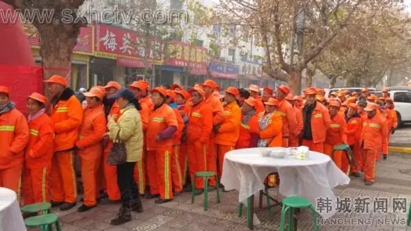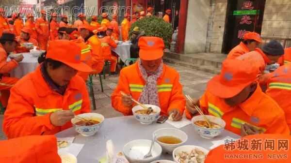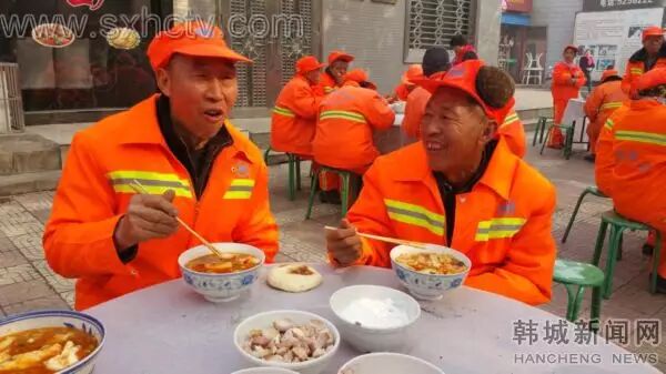 11月30日中午,韩城市招商区片区200多位身穿橙色环卫服的环卫工人准时入席,他们脸上挂着喜悦的微笑,连声感谢一羊肉馆的老板“宴请”他们吃羊肉泡馍。
