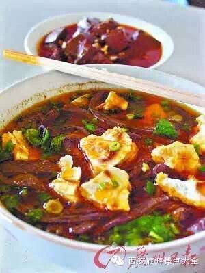 从八仙庵拐过去柿园路,再拐进景龙池,就是本地人经常去吃的东关赵记粉汤羊血店,西安小吃有“三泡”,说的是西安的三种泡馍类小吃,即牛羊肉泡馍、葫芦头和粉汤羊血。粉汤羊血店较少,东关赵记粉汤羊血则是其中有名的一家。粉汤羊血得自己掰好馍,然后掌勺的师傅加入切好的羊血丝,放进滚开的锅中焯一下后捞入碗内,放入粉丝,最后给碗中舀滚烫的热汤,片刻后再把汤倒入锅中,如此反复数次,直至馍块已经泡热泡软时为止。最后放上豆腐片,再按个人口味加辣子油、蒜苗末、香菜末等即好。在等待的时间里,还可以先来尝一下这里同样主打的辣子蒜羊血。它是把大蒜捣碎成蒜泥,拌入羊血块中,再加以辣椒油、盐、醋等调料,拌匀即可食用。辣椒油和蒜泥,在西安人看来,自然是越多越好,旁边还放着大蒜任你剥,不过吃完了别忘嚼口香糖啊!