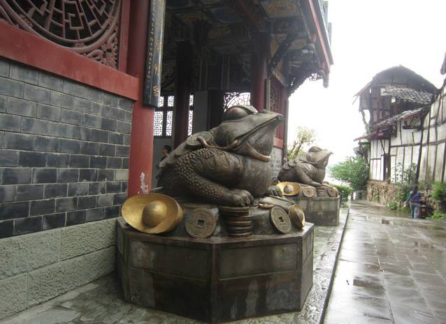 财神楼出入口各有两个仿铜雕塑“金蟾三纳财”赫然映入眼帘。金蟾就是一种三脚蟾蜍,古人认为它是一种可以支付的灵物。