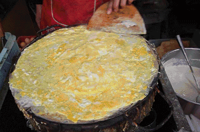 街边,常有推着小车的煎饼果子摊。一勺面糊,轻轻的在热铁盘上转均匀,打上一个鸡蛋,成型时翻面,涂抹辣椒酱、甜面酱,配上生菜、土豆丝、红萝卜丝、火腿肠、香菜等。