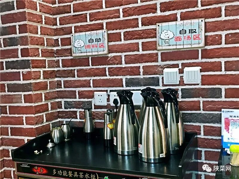 店内挂着温馨提示,贴心的为食客考虑,还设置了自助的调料台,食客可以根据自己的口味调制汁水,饺子汤也是用保温壶装的,什么时候喝都是热乎乎的,让人觉得很暖。
