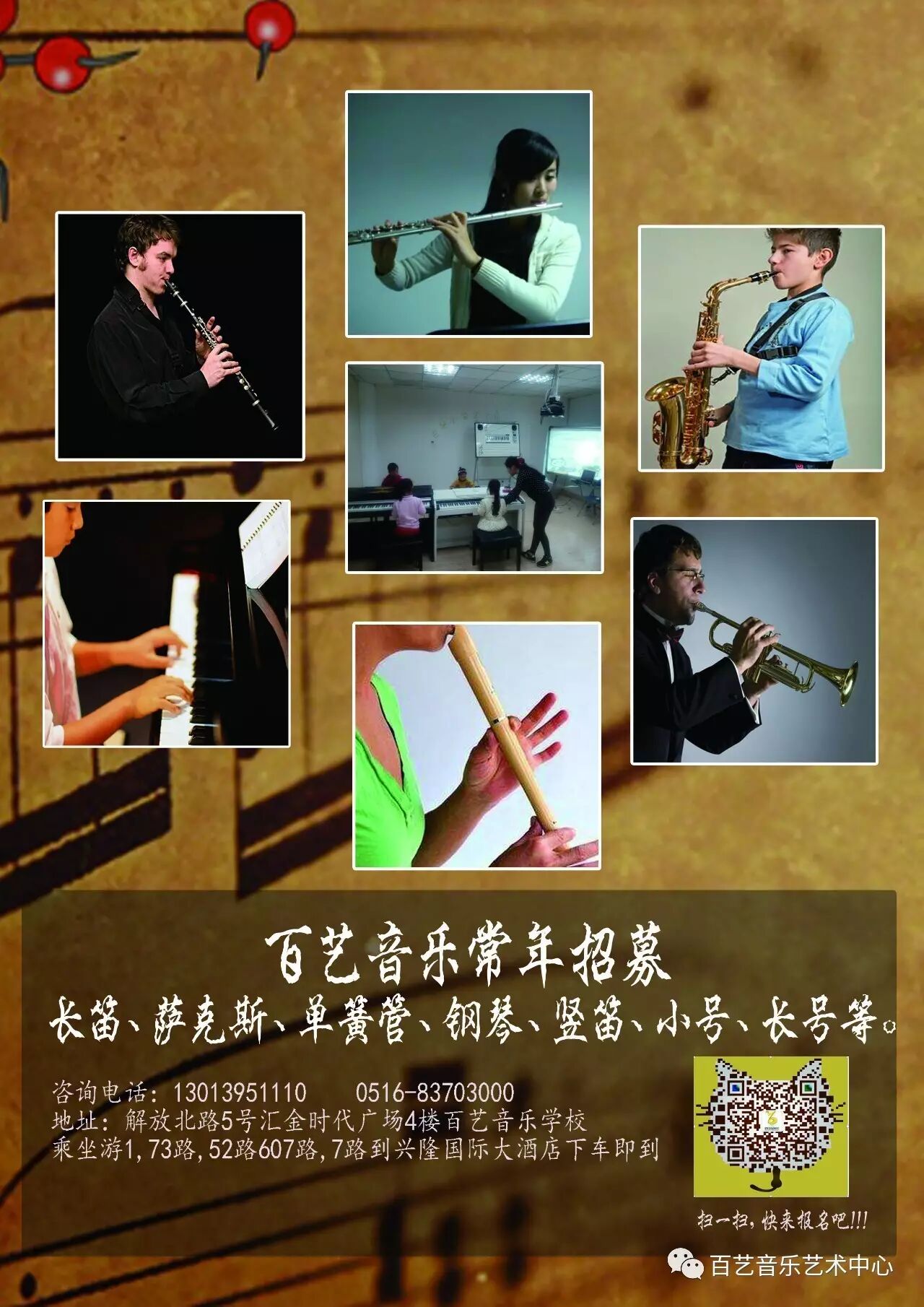 徐州百艺音乐学校常年开设:钢琴、数码键盘、长笛、萨克斯、单簧管、小号、长号、艺考辅导等。